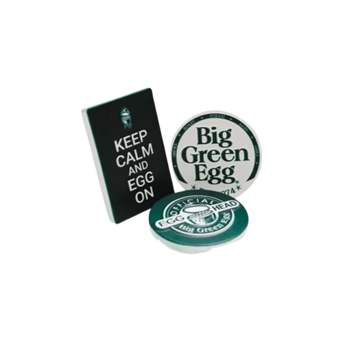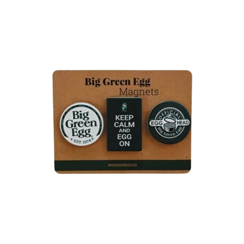 Het trio van magneten is uitgevoerd in de kleuren Big Green Egg-groen en wit en is voorzien van verschillende teksten: ‘Keep calm and EGG on’, ‘Big Green Egg Est. 1974’ en ‘Official EGGhead. Een origineel gadget om te geven en om te krijgen!