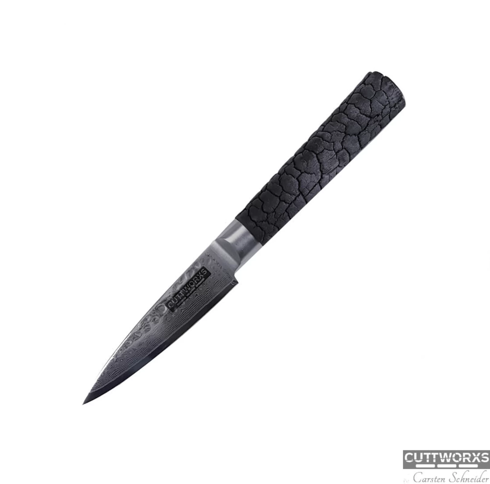 Een echte alleskunner in de keuken. Zo is een officemes ook ideaal voor versnipperen van uien, het schillen van fruit, maar je kan er evengoed garnalen mee schoonmaken. Maar dan in een zeer speciaal ontwerp. Het vlijmscherpe lemmet van dit mes springt in het oog door zijn bijzondere vormgeving. Het gehamerde lemmet, de fijne damaststructuren en tenslotte het met FlameWOOD® gepatenteerde handvat van gebrand hout maken dit mes uniek. Zoals alle Cuttworxs messen ligt het office mes perfect in de hand en zorgt het voor de perfecte snede.