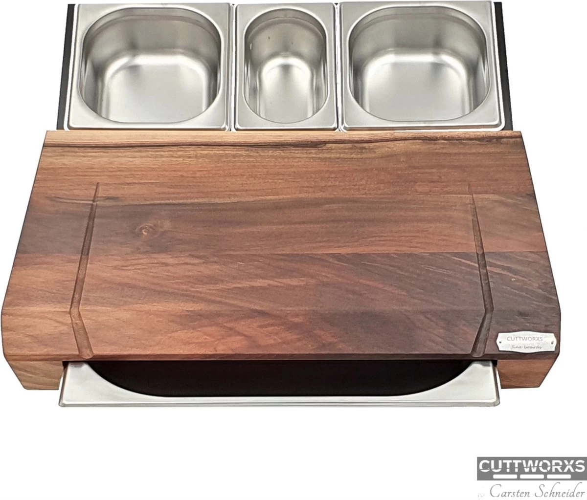 Het is een snijplank, werkplaats en werkplek in één. Het bovenblad is vervaardigd van hoogwaardig notenenhout. En is een absolute “must have” voor veeleisende gebruikers die een functionele en schone werkplek wensen voor het bereiden van gerechten. Bijna geen enkele ander keukenaccessoire is zo stijlvol als de Bloxxwork Infinity Snijplank met de geintegreerde gastronorm opvangbak.