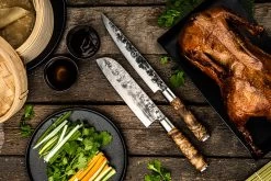 De Katai messen van Forged hebben een uniek en chic uiterlijk. Het lemmet is voorzien van fijne hamerslagen, wat de Katai messen de kenmerkende Forged look meegeeft. Het lemmet is volledig met de hand gesmeed in 5 lagen van Japans VG10 staal. Het heft is op zijn beurt vervaardigd van wortelhout. Het hout is eerst afgevuld met hars, hierna geperst en vervolgens gemodelleerd,hierdoor is elk mes uniek in afwerking, afmeting, kleur en houtstructuur.