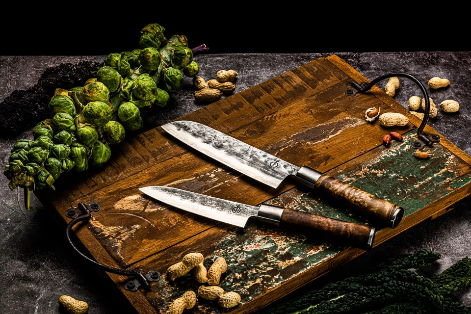 Een santoku schommelt niet op het snijoppervlak zoals het lemmet van een koksmes, dit komt door het platte lemmet. Je houdt een santoku vast bij het handvat en snijdt met een beweging van achter-boven naar beneden-voor. Bij elke snede verliest het lemmet dus contact met de snijplank.