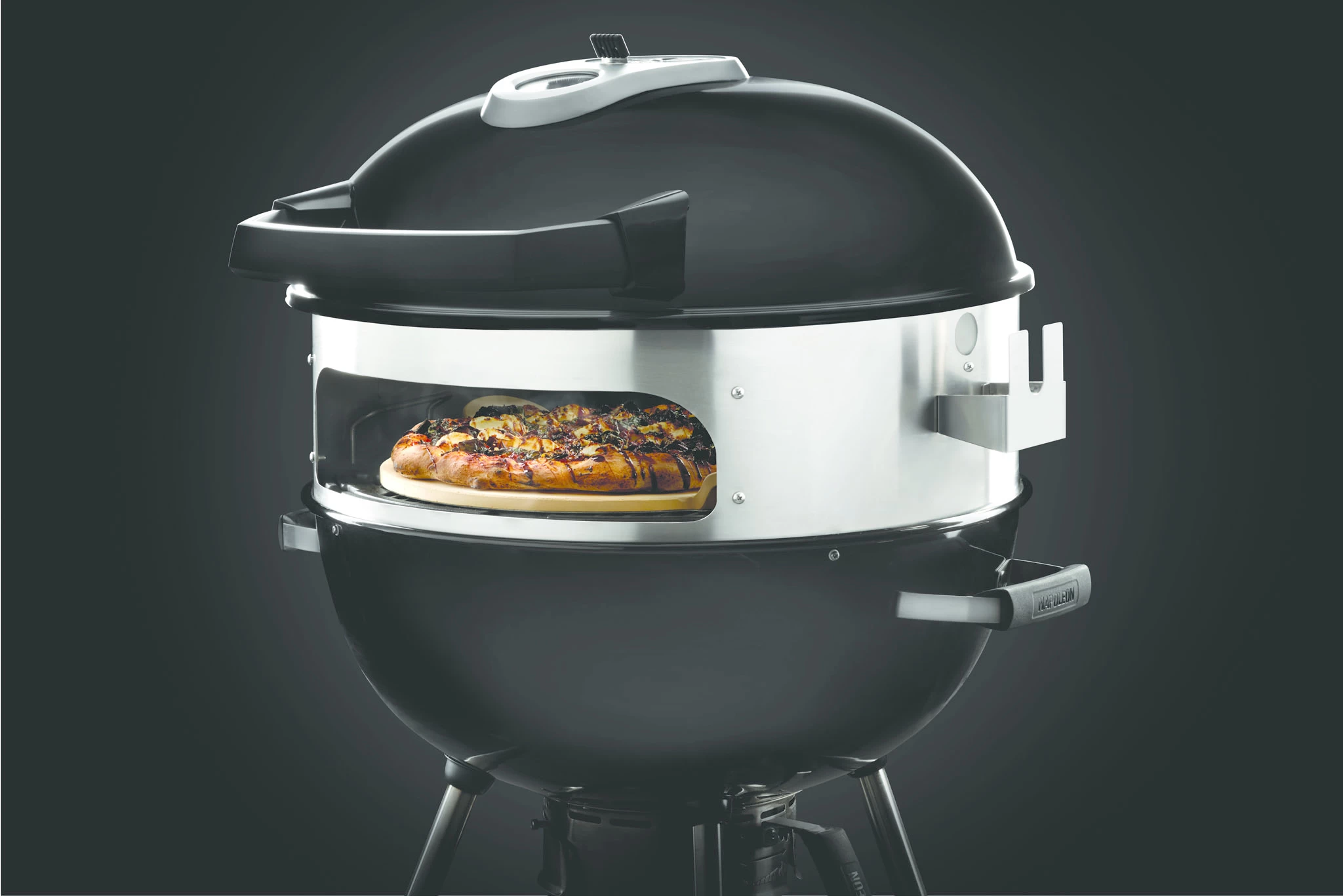 Dit accessoire is een draaispit en pizzaoven in één! Met het draaispit kun je vlees uren laten draaien om zo het beste resultaat te behalen, namelijk sappig vlees vol smaak. Wanneer je juist zin hebt in een pizza kun je het spit eenvoudig ombouwen tot pizzaoven, zo kun je genieten van heerlijke pizza met een krokante bodem. De deksel blijft gesloten, je kunt het deurtje openen en je pizza er super makkelijk in schuiven zonder warmte te verliezen!