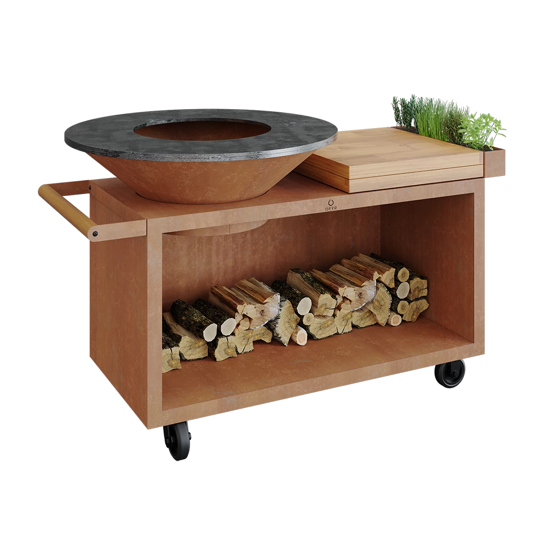 De OFYR Island Pro is een complete buitenkeuken met de unieke OFYR vormgeving, hij staat op vier zwenkwielen en kan daardoor eenvoudig verplaatst worden in de tuin. De Island Pro is verder uitgerust met een teak houten of een donker grijze keramisch werkblad voor het bereiden van gerechten. Uitgerust met een praktische houder voor accessoires en specerijen en een houtopslagplaats (± 0,4 m³ hout).