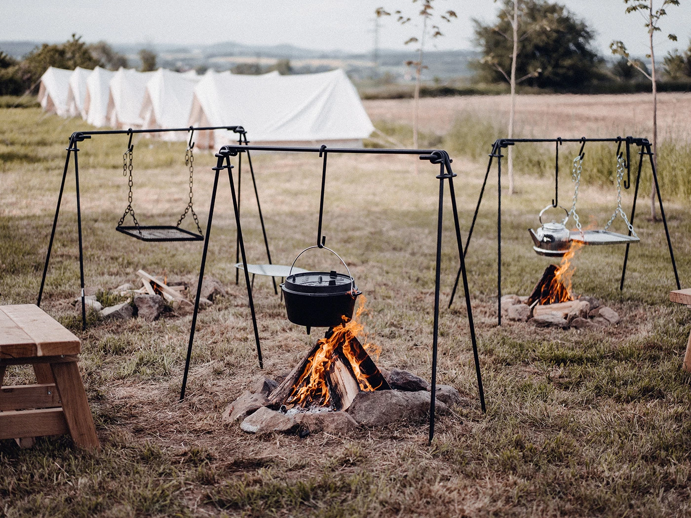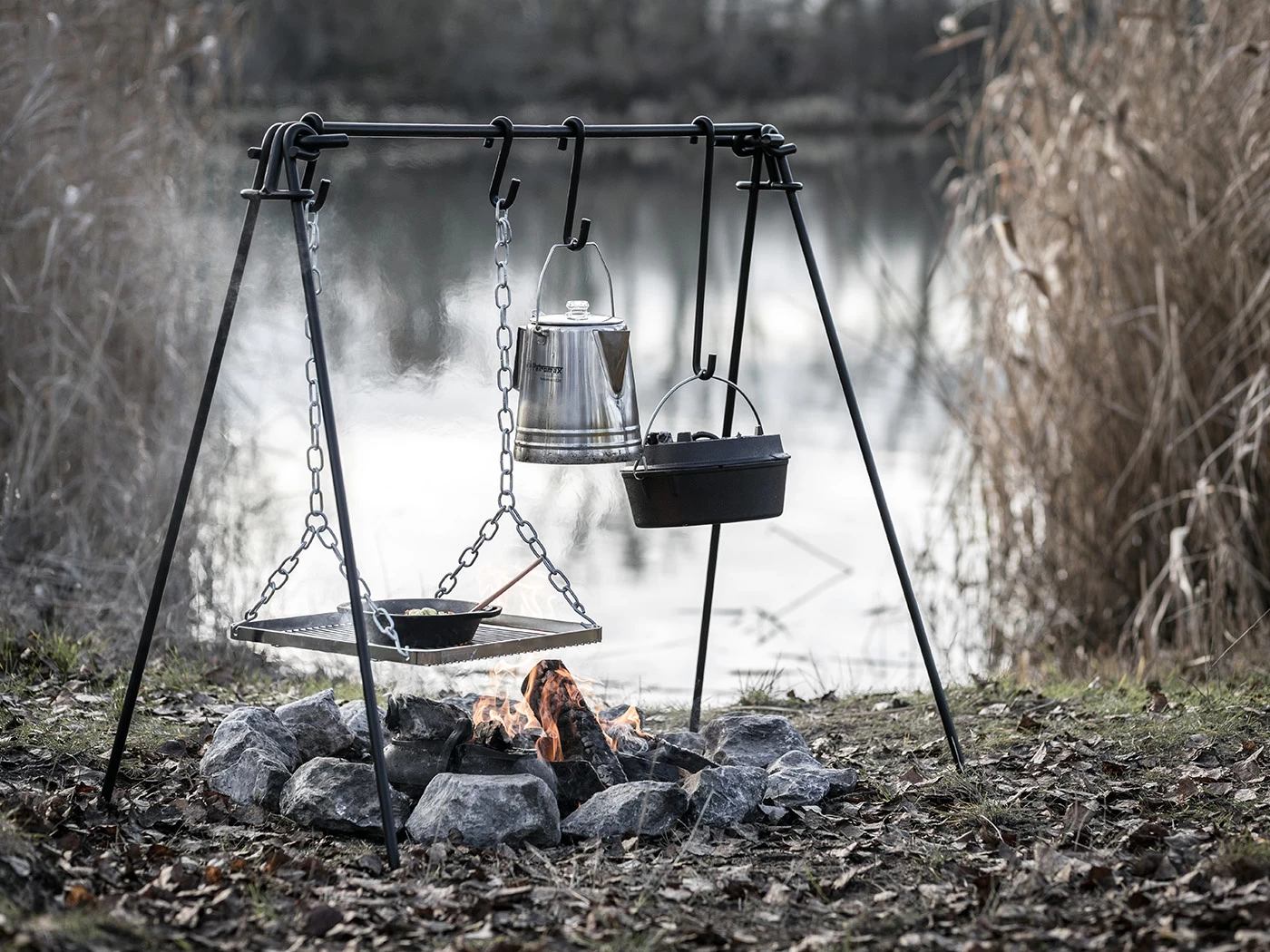 Met de Petromax vuurbrug kunnen kookpotten zoals de Dutch Oven worden opgehangen boven het vuur, waardoor de hitte gelijkmatig wordt verdeeld en de inhoud van de kookpot niet aanbrandt. Hierdoor is het mogelijk om op een veilige en effectieve manier buiten te koken met behulp van een open vuur. Je kan de pannen of ketels ophangen aan de drie haken met verschillende lengtes om zo de afstand tot het vuur aan te passen en de kooktemperatuur van je gerechten en dranken te regelen. Het grillrooster heeft een flexibele, in lengte verstelbare kettingophanging.
