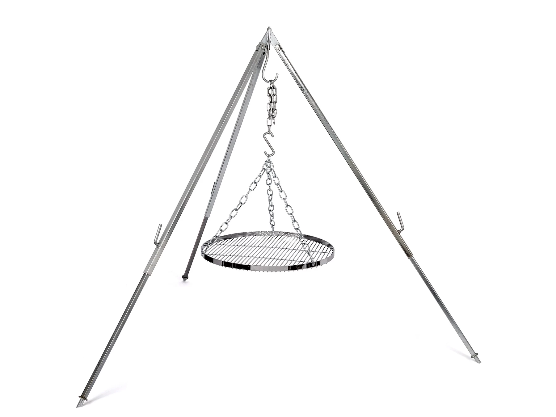 Het rooster is ontworpen om aan verschillende ophangpunten te worden bevestigd, zoals een driepoot, kettingen of haken boven het vuur. Hierdoor kun je de hoogte van het rooster aanpassen en de intensiteit van de warmte regelen tijdens het koken.